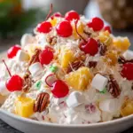 Imagine taking a forkful of this enchanting concoction: a perfect balance of creaminess and refreshing fruit explosions swirling together. Each bite reveals a symphony of flavors—the sweet tang of crushed pineapples, crisp cherries bursting with juiciness, the satisfying crunch of pecans, and the soft little pillows of mini marshmallows adding a gentle sweetness to every mouthful. The texture is a delightful play between creamy and crunchy, with a subtle tropical flair. This salad doesn’t just please the taste buds; it invites you to lose yourself in a sweet moment of pure joy.