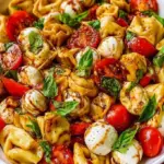 A vibrant and refreshing pasta salad featuring cheese tortellini, cherry tomatoes, mozzarella, and fresh basil, all tossed in a tangy balsamic vinaigrette.