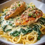 A comforting and elegant dish featuring succulent chicken breasts in a rich, creamy sauce with vibrant spinach and Parmesan cheese, served over pasta.