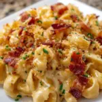 A comforting bowl of creamy and cheesy pasta, enhanced with crispy bacon and caramelized onions, perfect for family gatherings and cozy evenings.