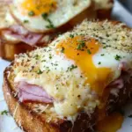 Croque Madame toast topped with ham and cheese, a delicious French breakfast option.