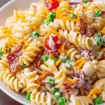 A delightful pasta salad bursting with flavor from crispy bacon, creamy ranch dressing, and colorful peas.
