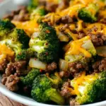 A comforting skillet dish featuring ground beef and fresh broccoli, enveloped in a creamy cheddar sauce, perfect for a low-carb meal.