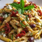 A flavor-packed Mediterranean Pasta dish with sun-dried tomatoes, olives, and feta cheese that offers a delightful medley of tastes and textures.