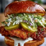 The magic kicks off with a simple brine, where chicken cutlets luxuriate in the tangy embrace of dill pickle juice. This step is crucial; the acidic pickle juice not only infuses the chicken with vibrant flavor but also creates a juicy, succulent texture that contrasts beautifully with the crunchy, golden exterior. Combined with a bright, creamy slaw and a generous smear of mayo or spicy aioli, this sandwich becomes a celebration of delightful contrasts—crunch versus tenderness, tang against creaminess, and a little bite from the spices. Get ready for praises and satisfied smiles around the table as you serve up this masterpiece!