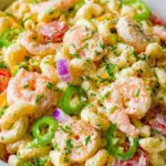 This Shrimp Pasta Salad stands out as a dish that perfectly balances taste, nourishment, and occasion versatility. It delights your senses while providing a wholesome, satisfying meal. The combination of juicy shrimp, al dente pasta, and colorful veggies spins a tapestry of textures—crunchy, creamy, and hearty. Each ingredient contributes to a delightful medley, from the sweet crunch of bell peppers to the tender shrimp that melts in your mouth.