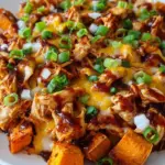 Savory scents fill the air, wrapping around you like a warm hug as the sweet potatoes sizzle in the skillet. Their natural sweetness caramelizes and blends with the smoky, tangy notes of barbecue chicken, igniting a delightful dance of flavors on your palate. The melty cheese promises a creamy, luscious finish that brings everything together in a rich, gooey embrace. Each bite offers a wonderful contrast, with crispy bits of onion and garlic adding a satisfying crunch, perfectly complementing the tenderness of the chicken and sweet potato. You close your eyes, savoring the moment, and you can’t help but relish the simple joy of cooking something that nourishes both body and soul.
