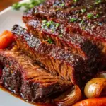 A comforting and savory tender braised beef brisket cooked slowly to perfection, infused with rich flavors from caramelized onions, red wine, and spices.